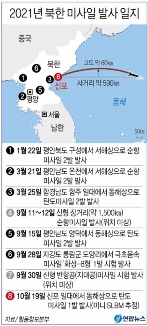 북은 이어 19일, 고도 60km 비행거리 약 590km의 신형 SLBM 시험발사를 했다. 비행 마지막 단계에서 회피(풀업·상하기동) 기동을 할 수 있어 요격이 쉽지 않다.