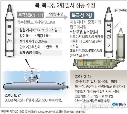 2월 12일, 북이 중장거리탄도미사일(IRBM) 북극성-2 시험발사를 합니다. 원통형 발사관에서 수직으로 발사돼 10여m 공중에서 엔진을 점화해 검은색 연기를 품은 뒤 완전 부스터 단계로 돌입해 흰색 연기를 내뿜고 날아오릅니다. 발사각은 고각발사로 89도, 방향은 정동 쪽으로 날아가 최고 고도로 550여㎞를 찍습니다. 그리고는 500㎞를 비행해 동해상에 낙하합니다.