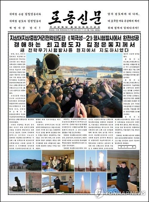 이번에도 꼭 그랬습니다. 북 노동당 기관지 노동신문은 13일 1∼2면에 전날 이뤄진 북극성-2 시험발사 및 김정은 노동당 위원장의 참관 모습을 담은 컬러사진 30장을 게재합니다.